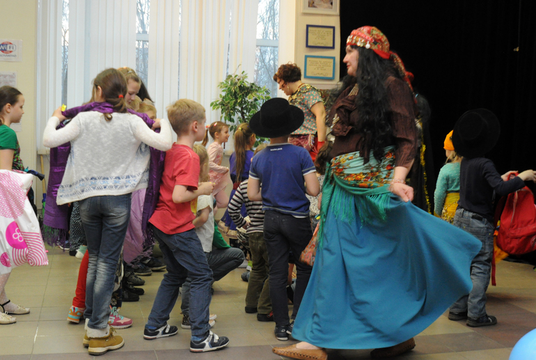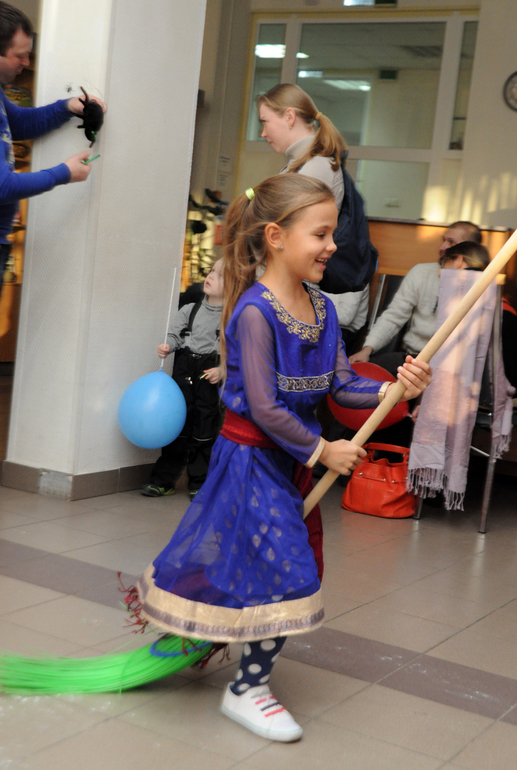 Тут дети дошли до логова ведьм и выполняли задания - разрисовывали шары, скакали на метлах.