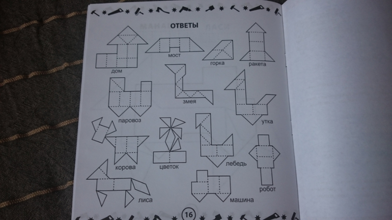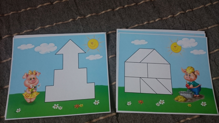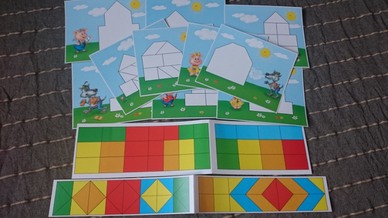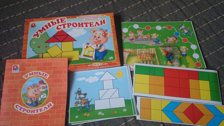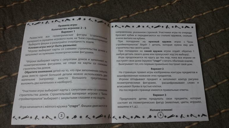 Мария! Извините с опозданием отвечаю. Да, две игры в одной. Даже можно сказать три: 1) ходилка, но с использованием карточек, 2) типа танграмм в вариантах: карточки со строительством домиков: с линиями-подсказками и без них, и контуры предметов со страниц в буклете, 3) проявляем фантазию - сами складываем из фигур что-либо.