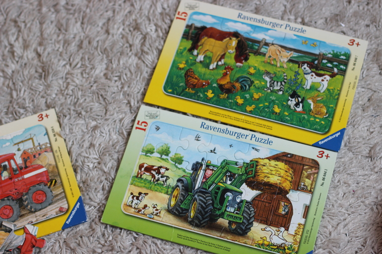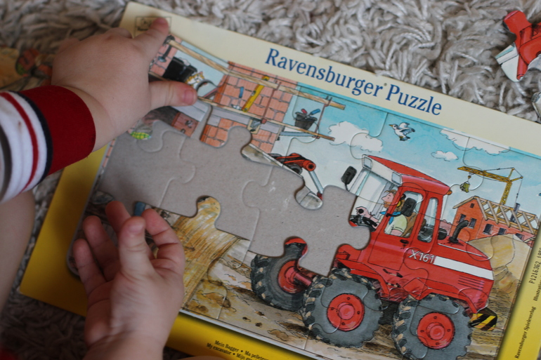еще раньше он собирал пазлы-половинки, теперь перешли на пазлы из 15 кусочков, ravensburger. Картинки интересные, подложка плотная картонная, детали идеально вырезаны и не доставляют неудобств маленьким ручкам собирать. В общем, это идеальные пазлы.