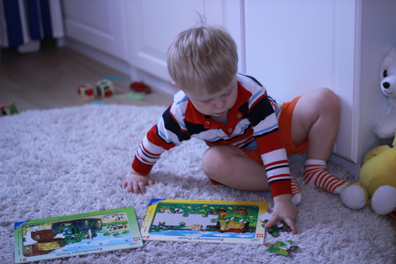 Развивающие игрушки (пазлы, вкладыши, конструкторы, мозаики)Я с детства люблю собирать пазлы. До сих пор помню, как просила родителей подарить набор лего, а вместо этого получила очередной большой пазл))) Старший Кирилл собирает пазлы давно, самый пик был как раз на рождение среднего Мишутки, тогда было Кирюше 2,7. Михаила сейчас учу собирать, он проявляет интерес