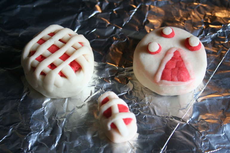 Раскрашивали мы все наши изделия обычной акварелью. Для придания реалистичности я использовала муку и кондитерскую посыпку, которые клеила на ПВА. В целом, почти всегда мы следовали МК, но много фантазировали и сами. Стоит только начать, потом уже трудно остановиться! Вот посмотрите какие пироги получаются из формочки от свечки и подкрашенного гуашью теста. Загляденье просто. Можно даже не раскрашивать :-)