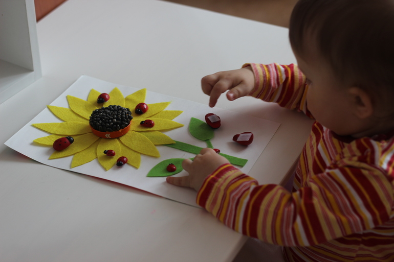 Игра, в которой попутно развивается мелкая моторика. Нужно посадить божьих коровок на подсолнух, а потом собрать семечки. Стебель и лепестки сделаны из фетра, сердцевина - крышечка, пластилин и настоящие семечки.