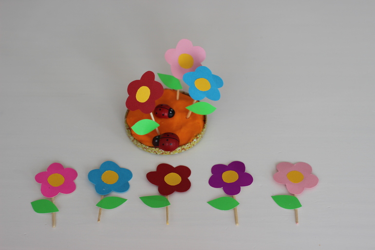 Из спичек и картона склеила цветочки, которые нужно посадить в клумбу (из крышки и пластилина).
