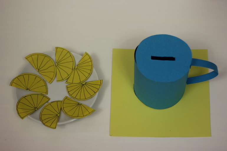 Вот, например, нужно положить дольки лимона в кружку с чаем (всё сделано из картона).