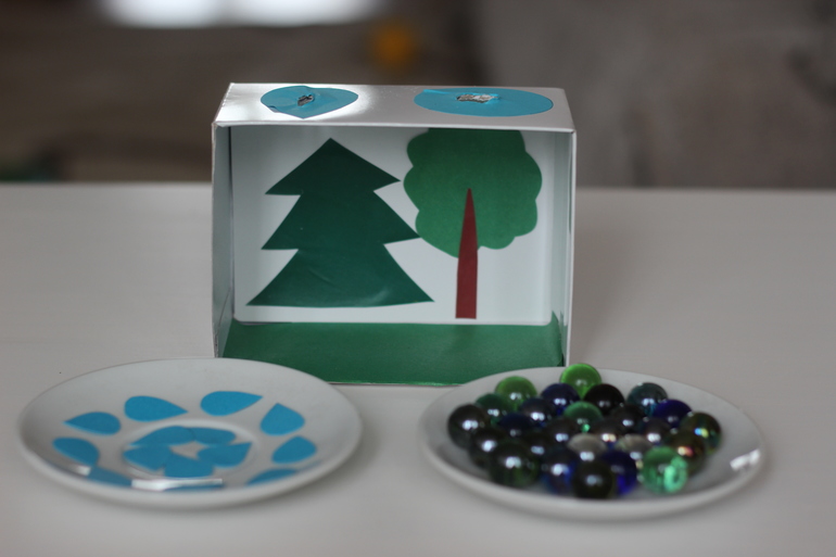 А в лесу у нас шёл дождь и град. Нужно протолкнуть шарики града и капельки дождя в соответствующие отверстия.