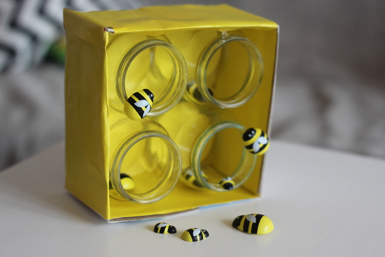 Из коробки и баночек детского питания смастерила улей для пчёлок. Нужно помочь пчёлам попасть домой.