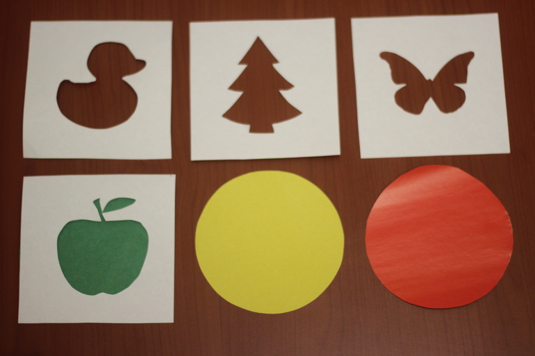 Изучали цвета. Вырезала трафареты с различными изображениями и кружки из цветной бумаги. Показывала дочке, что яблоко может быть зелёным, а может быть и красным, и т.д.