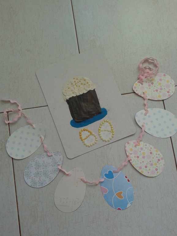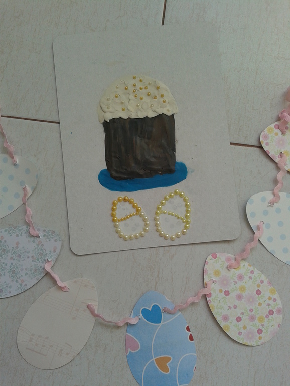 Соня отлично постаралась, делая куличик и яички (мелкие полубусинки я сделала сама с трудом).
