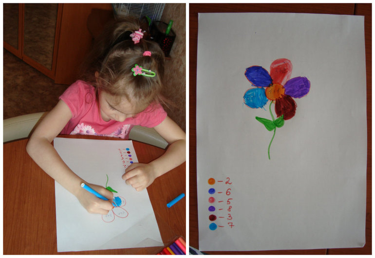 Нужно раскрасить цветок, предварительно решив примеры и определив нужный цвет.