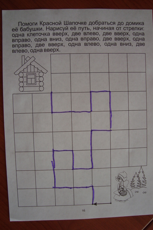 Нужно проводить Красную Шапочку к домику бабушки. Я диктовала маршрут, Тася вела Шапочку) Справилась без труда.