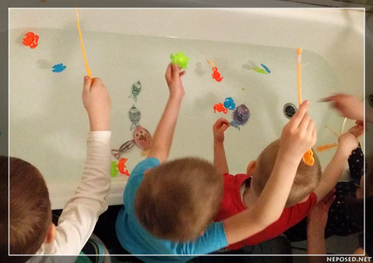 5. Магнитная рыбалка. Этот конкурс был просто для удовольствия. Дети очень любят играть в рыбалку. Рыбачили в ванной.