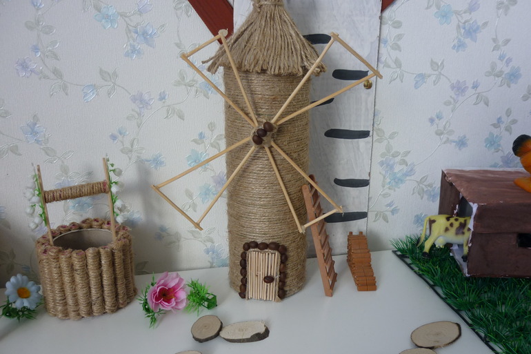 На втором этаже хранится зерно, корма для животных. Иногда там спит кошечка.