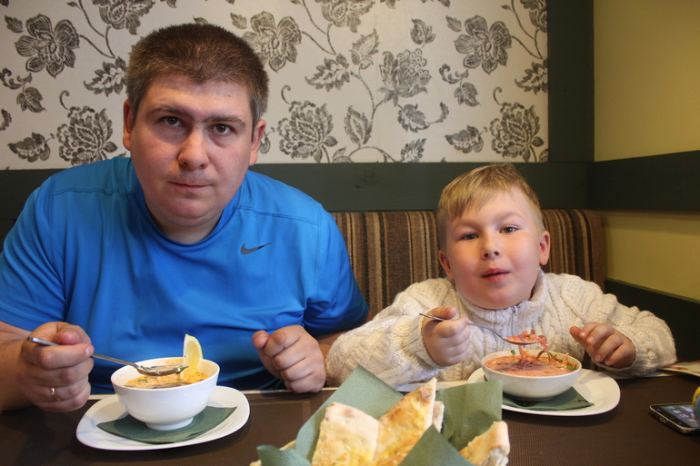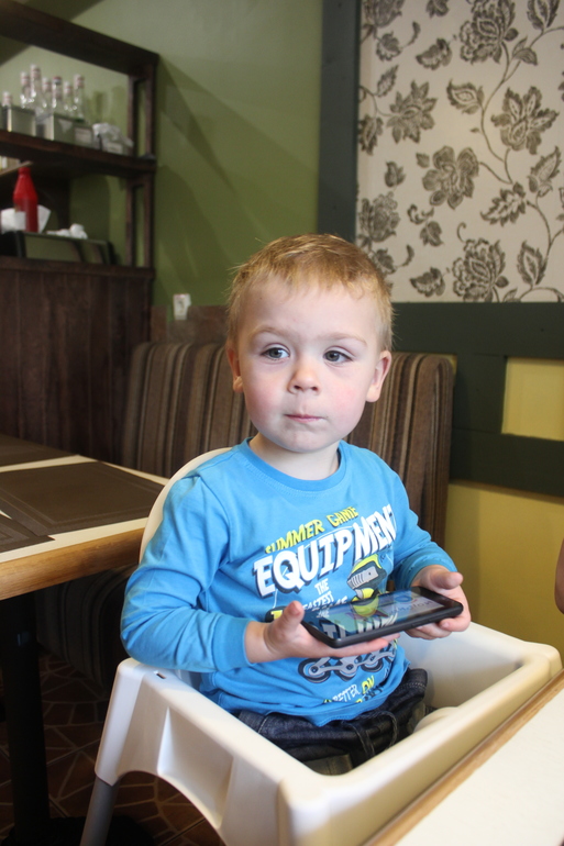 Зашли покушать... а то путь- то домой не близкий... Пока ждали мальчишки отвлекали себя мультиками по телефонам.