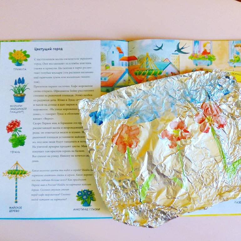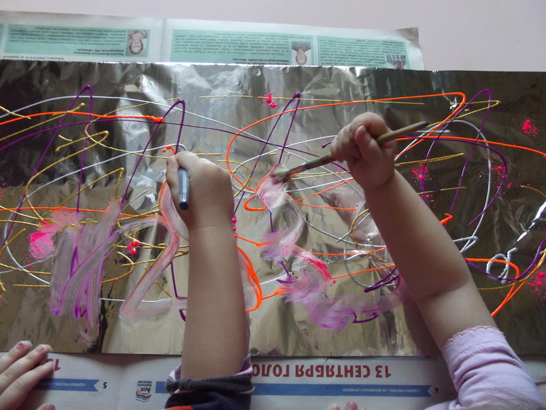 3. Фольга . Используем вместо бумаги для рисования красками .Рисуем на ней пеной для бритья или гуашью .