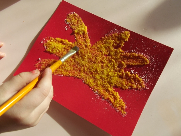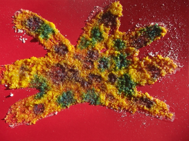 Рисование на соляной основе . Рисуем клеем картину,густо засыпаем солью и сушим.Лишнее стряхиваем.На готовую картину капаем акварель,получается очень красиво!![]()