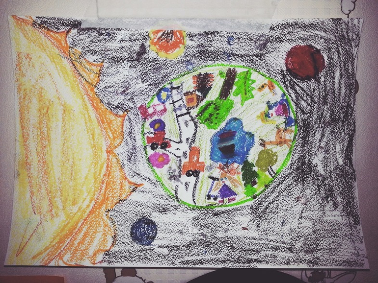 На заднем фоне рисунок с четырьмя планетами: Планета Песка, Солнца, Воды и Лугов)))