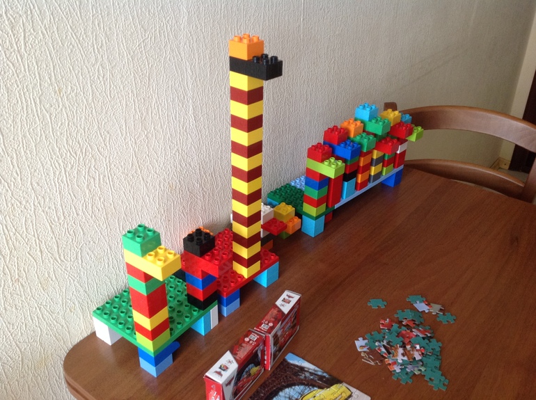 Развивающие игрушки (пазлы, вкладыши, конструкторы, мозаики)Столько всего строит сын последнее время, всего не успеваю сфотографировать)) когда у ребёнка только один конструктор приходится фантазировать!) ещё зимой прикупили на авито ему два б/у набора - больницу и набор с машинками, теперь есть крыша, мебель и самое главное большие пластины.