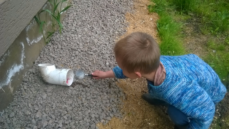Для полицейского я ещё могу придумать. Вот, например, машинка-преступник врезалась в другую, скрылась с места преступления, но она поранилась, и у неё течёт кровь (уж что в голову первое пришло). Развела красный краситель, полила им в нескольких местах, дала сыну в руки лупу для полноты образа, и мы пошли по следу))
