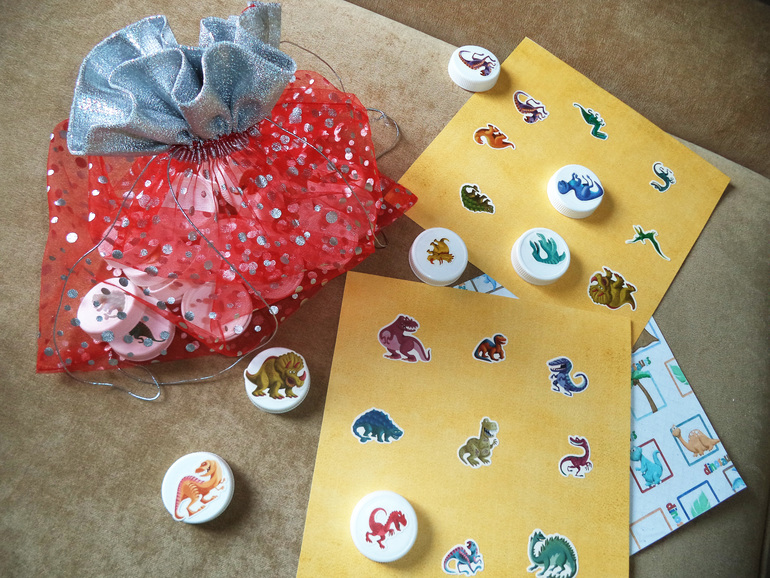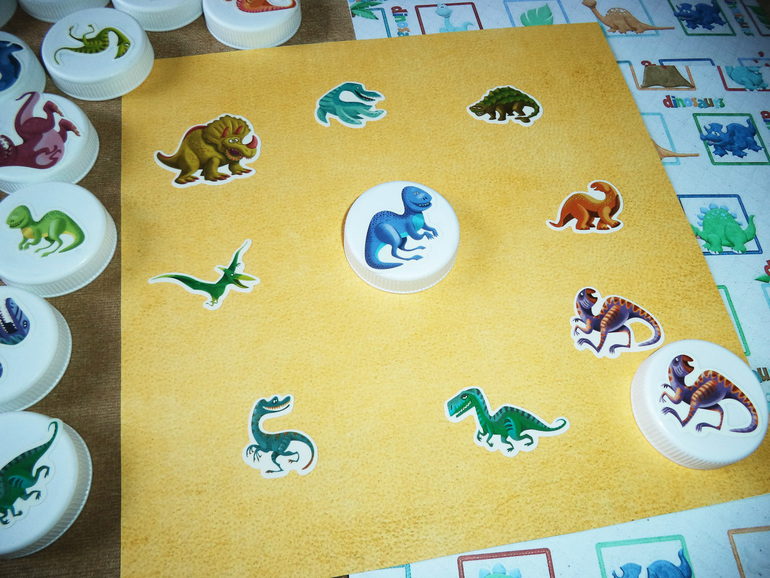 Крышки складываем в мешок, вытаскиваем по одной, находим такого же динозавра на игровом планшете, накрываем его «своей» крышечкой. Динозаврик пойман!