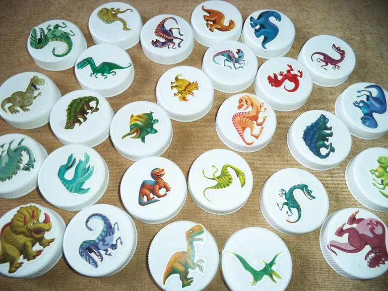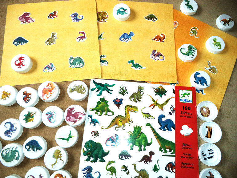 Можно играть одному - поймать всех динозавров на своем планшете - каждому динозавру подобрать соответствующую крышечку с его изображением. А можно играть вдвоем/ втроем (уж сколько пар наклеек найдется) как в лото.