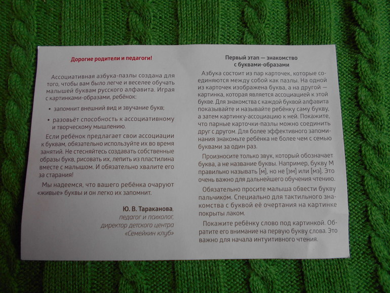 Теперь пару слов о наших занятиях. Дочь 5 лет знает уже многие буквы, но с удовольствием стала заниматься с карточками. Сначала мы решили их просто все рассмотреть ( "Мне не терпится всё увидеть" сказала моя дочка) В картинках-ассоциациях она легко узнавала уже знакомые буквы, безошибочно находила карточки с буквами и соединяла пазлы. Тут же мы стали учить новые буквы, которые никак не запоминались. Спустя неделю мы выучили с помощью карточек ещё несколько букв. Я не ставлю цели выучить ВСЕ буквы за какой-то определённый срок, мы можем изучать 5 букв в день, а можем и одну, всё зависит от настроения ребёнка, от погоды (лето же!) .