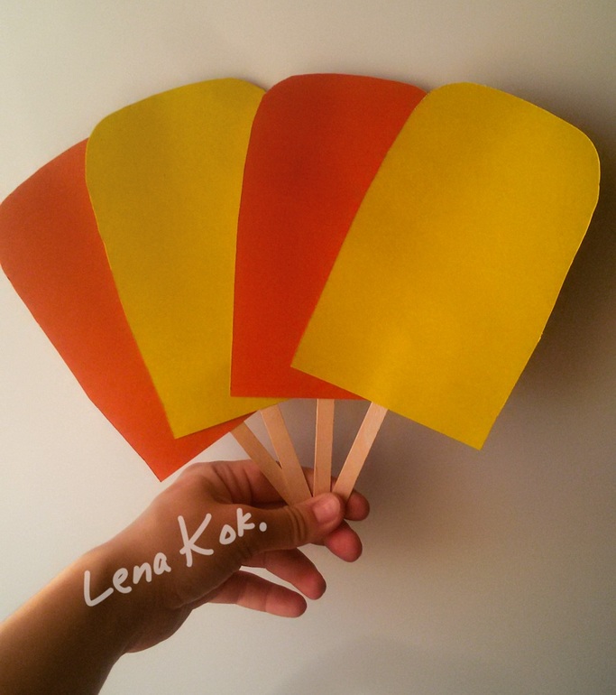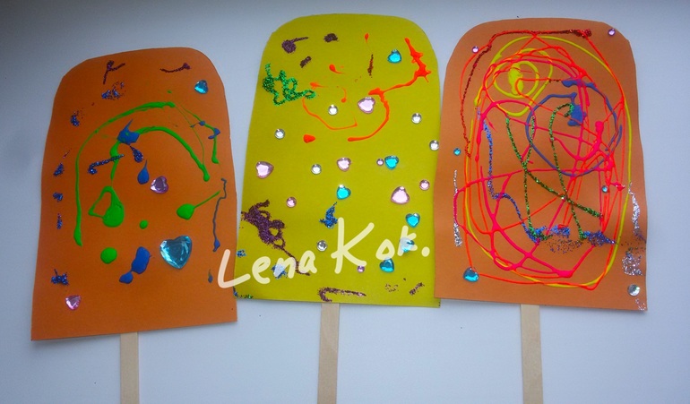 вырезала из цветного картона эскимо, а с др.стороны приклеила скотчем палочки от мороженного - все, заготовка готова ☺