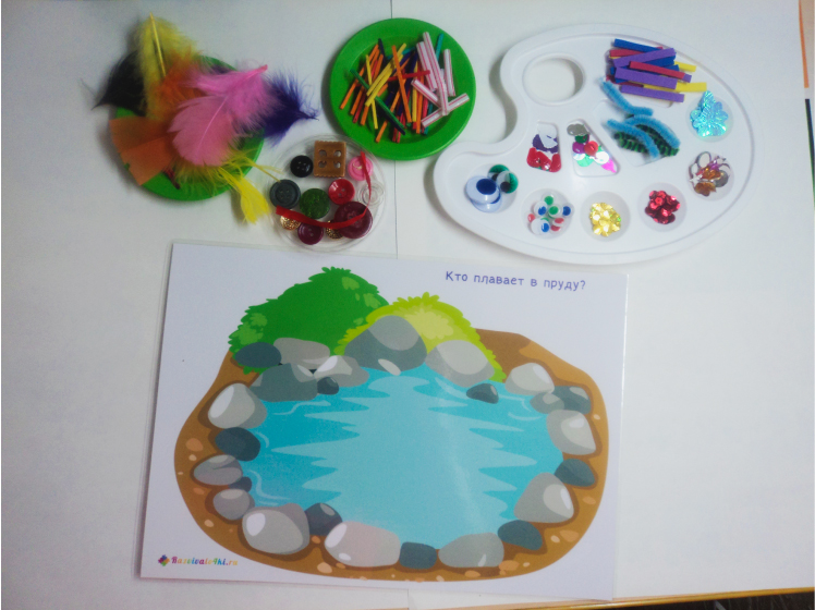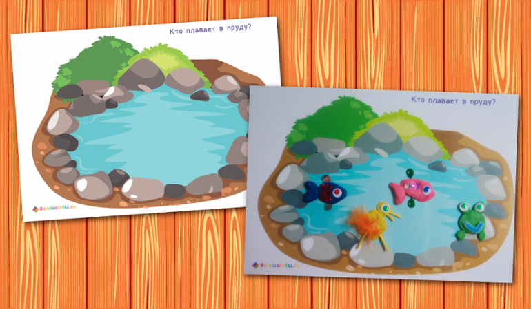 Перед началом творческой работы вашего малыша, покажите один из матов и задайте вопрос, написанный сверху (вопросы можете с легкостью менять на свои), обсудите возможные ответы. Помните, ответы малыша могут быть самые разные и порой, для вас казаться даже абсурдными, но не критикуйте их. Может, для ребенка этот пруд волшебный и живут там не рыбки и утки (привычные для нас), а рыбомедведи или живые камешки. Но, на некоторых занятиях, все таки делайте упор именно на реальных жителей пруда, чтобы ребенок в игровой форме изучил их.