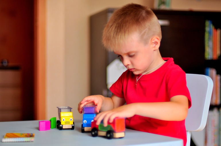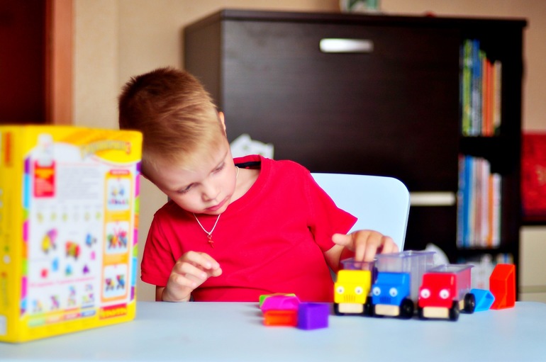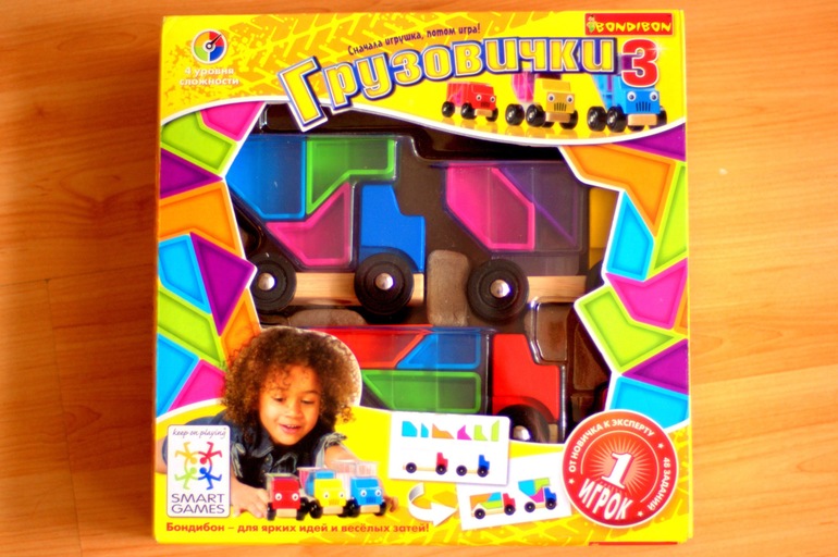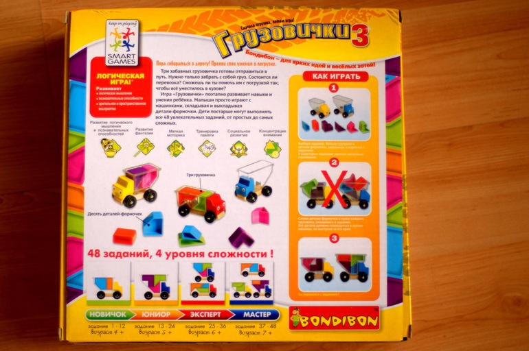 Три грузовичка, десять деталей-формочек, 48 заданий,4 уровня сложности.