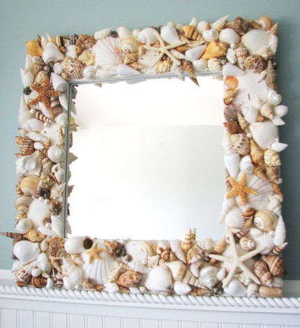 - Ракушками украшают рамки фотографий и зеркал, вазоны. Приклеивать ракушки лучше горячим пистолетом, но можно попробовать клеем Момент или ПВА (он должен быть густой и создавать на поверхности слой миллиметра 3).