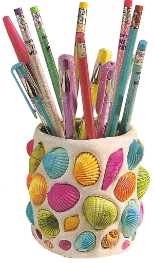 - Очень красиво смотрятся поделки из глины, гипса или даже теста, в которых встроены ракушки. Например, сделайте подставку для карандашей, в еще мокрую глину воткните ракушки и оставьте высыхать.