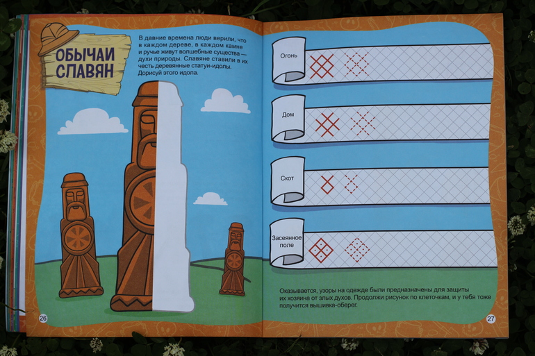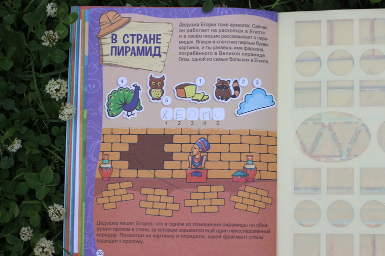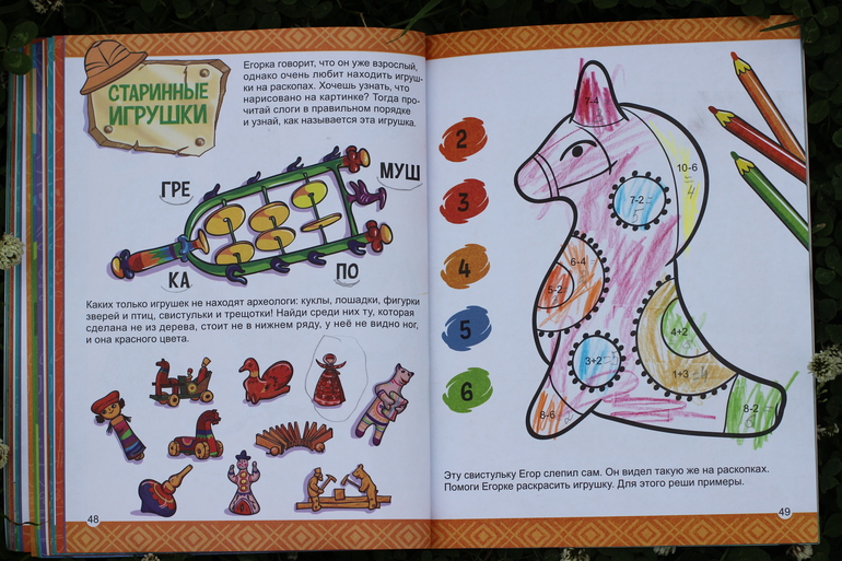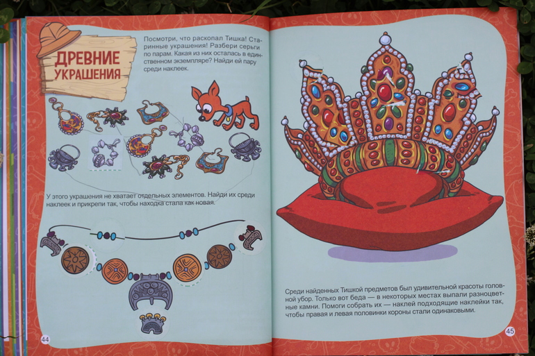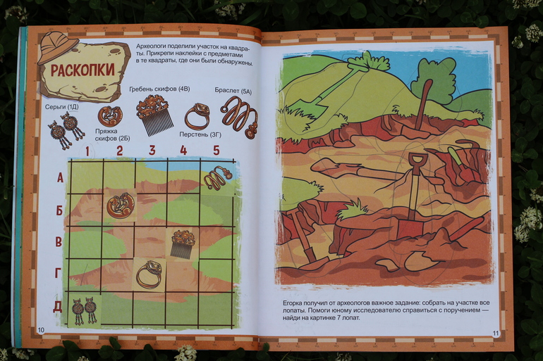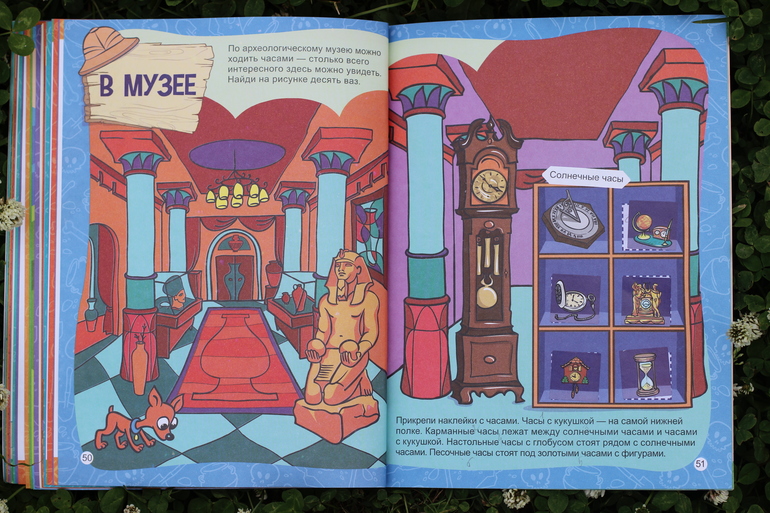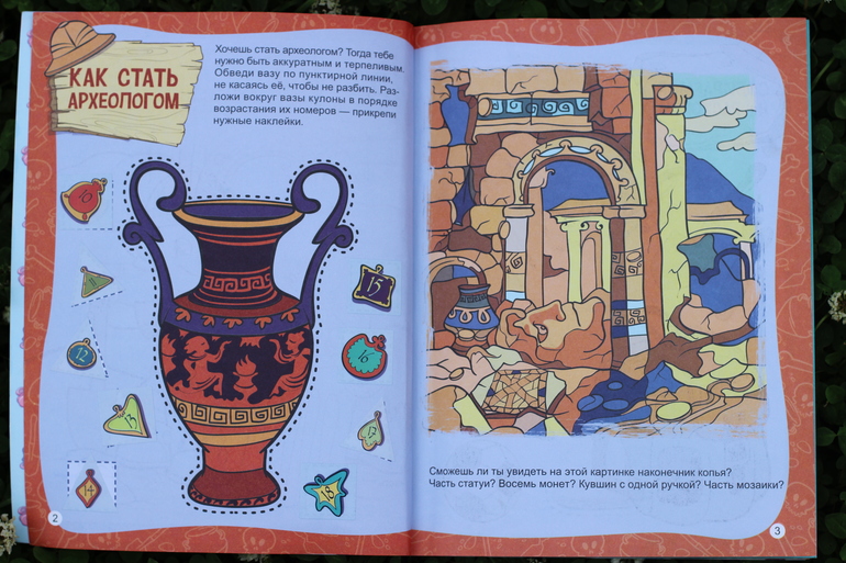 клеим наклейки- повторяем счёт; на внимательность- ищем часть статуи, наконечник копий