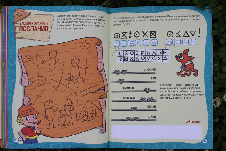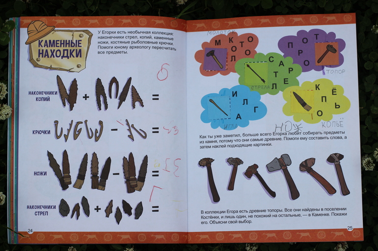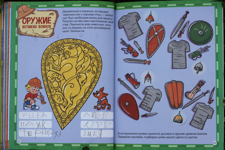 забыл написание цифр, выдал вот такие кривенькие значки) на другой странице вышел спор, Кирилл не согласен, что копье у авторов не совпадает с рисунком ножа, поэтому он подписал "нож")) С заданием на второй странице самостоятельно, конечно, не справился, не смог разобрать, поэтому я написала ему слова, он их читал и клеил наклейку