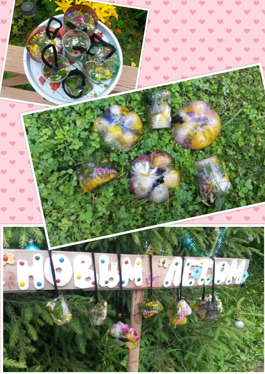 Делали подарок для Деда Мороза. Да-да, не удивляйтесь, у нас с ним свои отношения. Я уже писала про нашу чудо-елку, которую мы нарядили. Каждый день детишки находят в лукошке около нее что-то интересное. И вот появилась идея, а почему бы не порадовать Деда Мороза!? Сказано- сделано! Опять пригодились цветы. Разложили их по формочкам, залили водой и в морозилку. Все знают, Дед Мороз любит холод. А потом, получившийся лед повесили около елочки. Угощайся, дедушка! Сперва, правда, сами попробовали (полизали :), уж больно волновались, а вдруг ему не понравится.