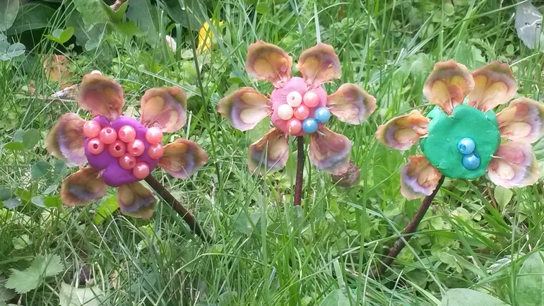 Белки обгрызают на елках шишки, в результате чего у нас земля усыпана шишковой шелухой. Тоже пустили в дело. Налепили цветов