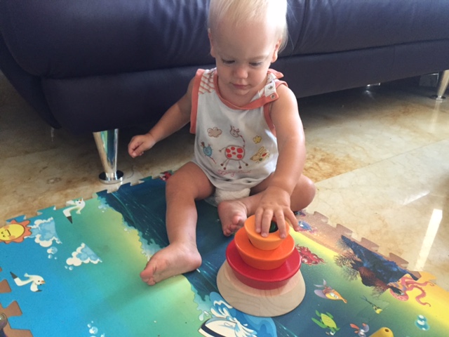 А если быть точным - пришла в голову идейка посчитать все возможные комбинации построения этой пирамидки, которую я извлекла из закромов с настороженностью и опаской. Помню, что со старшими мальчишками приходилось проявлять чудеса изобретательности, чтобы заинтересовать их подобными дидактическими игрушками. Младший тоже относился к пирамидкам без особого энтузиазма. Но эта покорила его мамино сердце с первого взгляда необычной конструкцией и продуманностью исполнения. Фишка в том, что отверстия деталей (колец) настолько широки и удобны для нанизывания и прочих манипуляций, что ребёнок легко овладевает новым навыком, сам того не зная и не замечая.