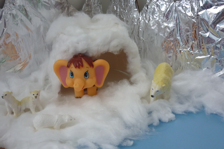Далеко на севере, на берегу океана, стояла скала. Внутри скалы находилась пещера, а в пещере, в большой глыбе льда.-замерзший Мамонтенок.Но однажды во время бури волны разбили скалу, и она рухнула! лед. в котором лежал Мамонтенок. растаял, и он ожил.