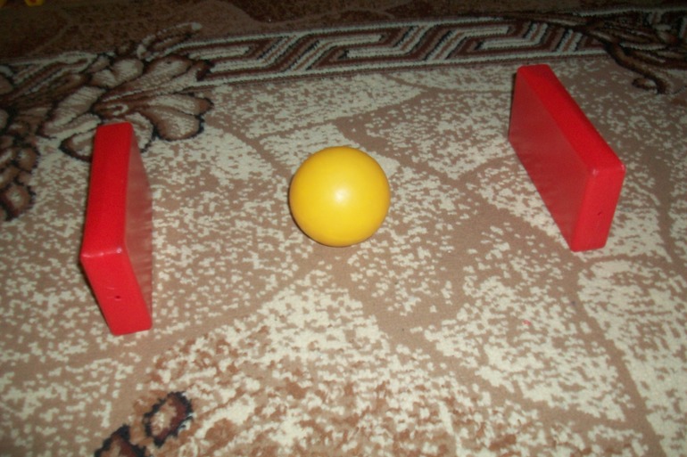 Принцип игры: красной деталькой я откидываю мячик сыну, а он своей деталью отбивает мне и т.д. (Ниже фото, совмещенное из двух, чтобы было видно наглядно)