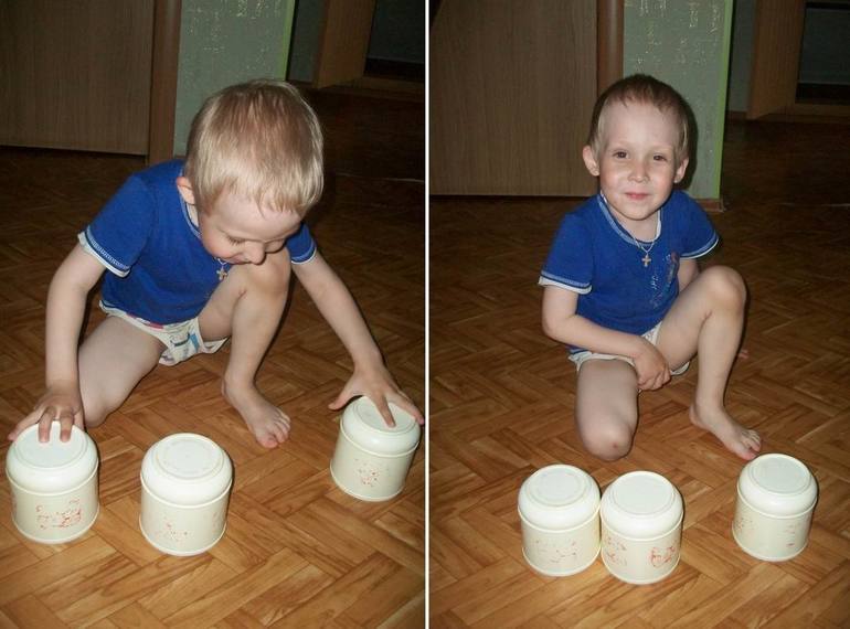 4. Игра в "стаканчики". У нас в качестве стаканчиков старые кухонные емкости. Прячем под одной из них мячик, я перепутываю стаканчики местами, сын следит и потом говорит, под какой емкостью мячик. Потом меняемся: он запутывает, а я угадываю.