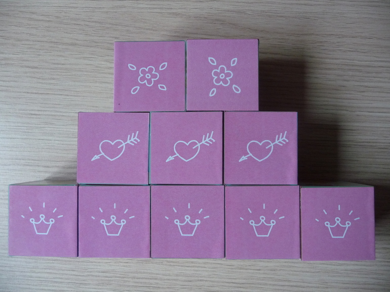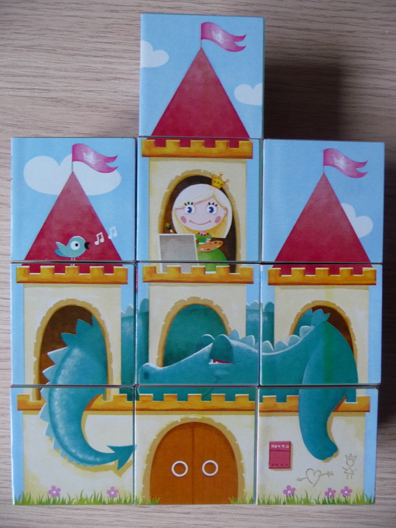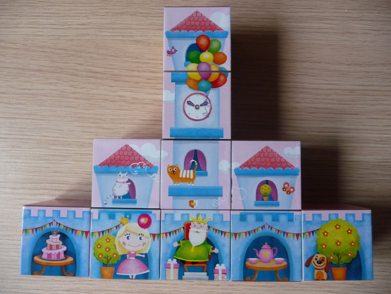 Конечно я не могла не взять такие прекрасные кубики для дочки : )) Размер кубиков 4х4х4 см, материал - пластик, картинки приклеены аккуратно. На упаковке указан возраст 1+, но думаю, кубики все же для ребяток постарше. Кубики упакованы в пленку, т.е. коробка для хранения не предусмотрена (я храню кубики в бумажном подарочном пакете). в наборе 10 кубиков, в отличие от подобных кубиков от "Десятого королевства" для сборки каждой картинки нужны все 10 кубиков. На двух гранях каждого кубика изображение сердца, короны или цветка на розовом фоне, которые не входят в состав рисунков для сборки. Мы с дочкой их просто собираем по типу и считаем.Обратите внимание, что на каждом рисунке изображены замки разных форм. Пофантазировать и собрать свой замок дочь пока не хочет, но думаю, все же стоит попробовать. В Интернете мне встретился отзыв о том, что если бы эти кубики сделать намного крупнее, пусть даже из плотного картона, как у Djeco, было бы просто замечательно. Я согласна с этим мнением, хотя цена на кубики возросла бы в несколько раз. Кстати, есть у нас и "Потешные кубики" этого же производителя. Их тоже очень любим. Про другие наши кубики можно прочесть здесь.