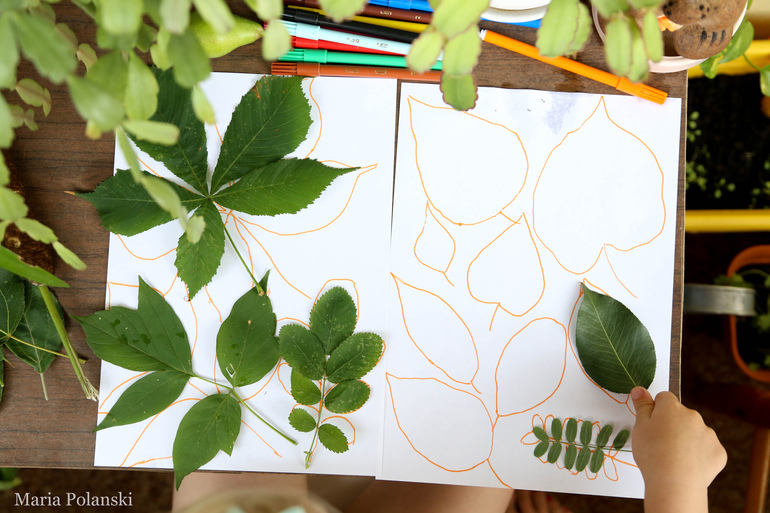Так что домашние занятия у нас были быстрыми. Вот например в один из дождливых дней мы раскладывали лото из листьев так, чтобы совпадали размеры и контуры листьев, а заодно изучали деревья и кустарники. Оказалось, что вокруг такое разнообразие! За листьями мы не ходили специально, я просто собрала по листочку со всего, что встретилось нам по дороге в библиотеку и набралось огромное количество видов!