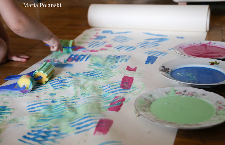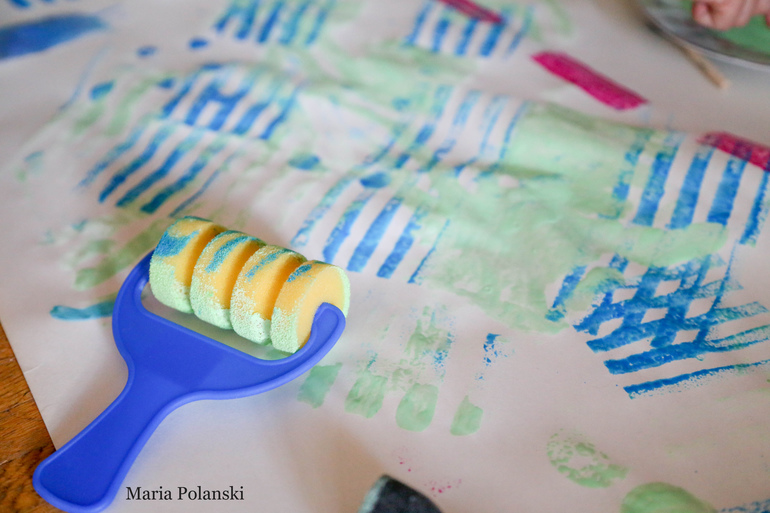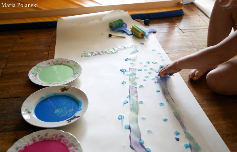 Из творчества покажу еще одно мое суперское приобретение! Это фигурные ролики и штампы для творчества. Я покупала в гипермаркете товаров для хобби "Леонардо", у них так же есть интенет-магазин. Стоят недорого, а радости сколько!))) Главное взять большой размер бумаги - старые обои или рулоны из Икеи как у нас. Краски у нас все те же - икеевская гуашь, разведенная водой, чтобы стала пожиже, и налитая в блюдца.
