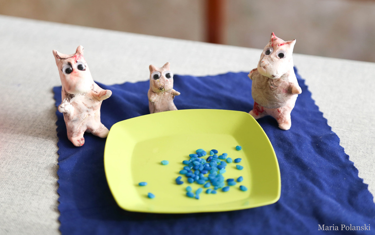 А еще мы играли сценки и просто собственные сюжеты с героями книг. Самые любимые книжные герои у Вари это муми-тролли, поэтому я слепила для нее целую семью - Муми-мама, Муми-папа и Муми-тролль!))) Все фигурки сделаны из глины . Это потрясающее изобретение нам подарили на Варин день рождения))) Из глины приятно и легко лепить, она не липнет к рукам и похожа на воздушный мусс, оставляющий на руках легкое ощущение свежести и влаги (как когда касаешься лепестков цветов), потому что она сделана на водной основе. Не имеет запаха, что для меня важно, не пачкает мебель! А самое главное - если слепленную фигурку оставить на воздухе она высохнет (за счет воды, а не химии!) и затвердеет! И такими фигурками можно играть)) В процессе лепки глина тоже подсыхает и начинает хуже лепиться, если ее надолго оставлять на воздухе, но это легко исправить - капаете в баночку с глиной немного воды, закрываете крышечкой и ставите в шкаф. На следующий день - вуаля - глина снова мягкая и наполнена влагой!))) А еще белую глину можно красить, причем чем угодно! Красители смешиваются со структурой глины и получается однородный цвет. В общем главное - покупать побольше)))) Потому что нам нашего набора явно мало.