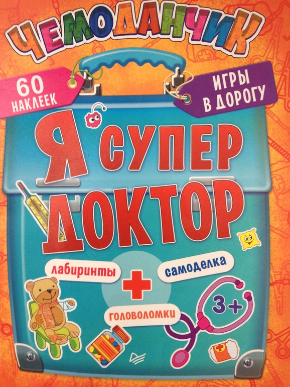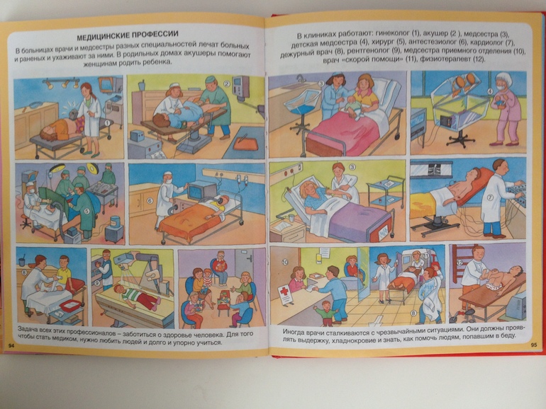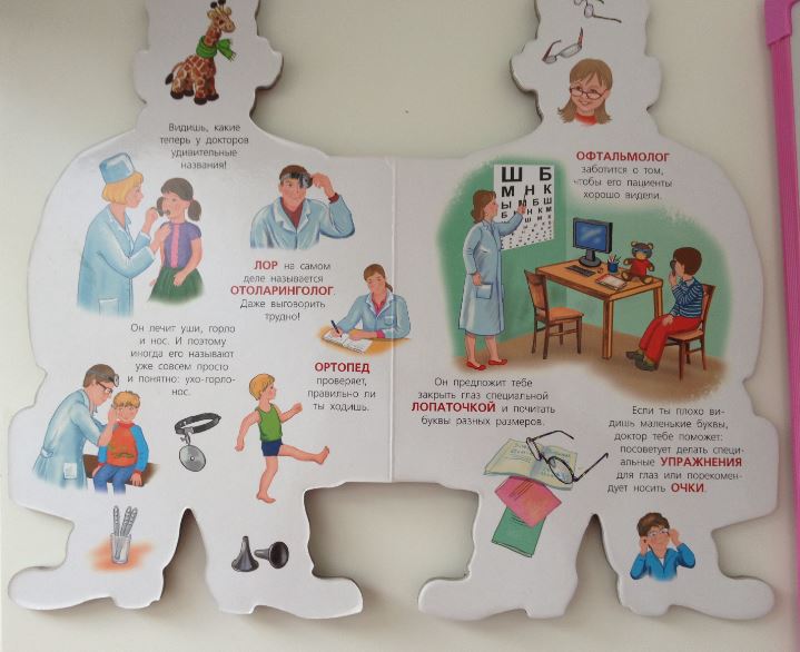 эта книга появилась , наверно еще когда Саше годик был. Я ее увидела в "Ленте" и взяла для ознакомления с профессией). А так как книга из плотного картона. я брала ее в поликлинику, на прием к врачу) . Вся книга посвещена врачам. краткая история профессии, какие бывают врачи, больница и аптека.