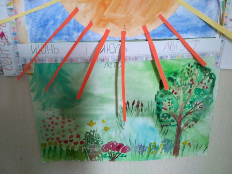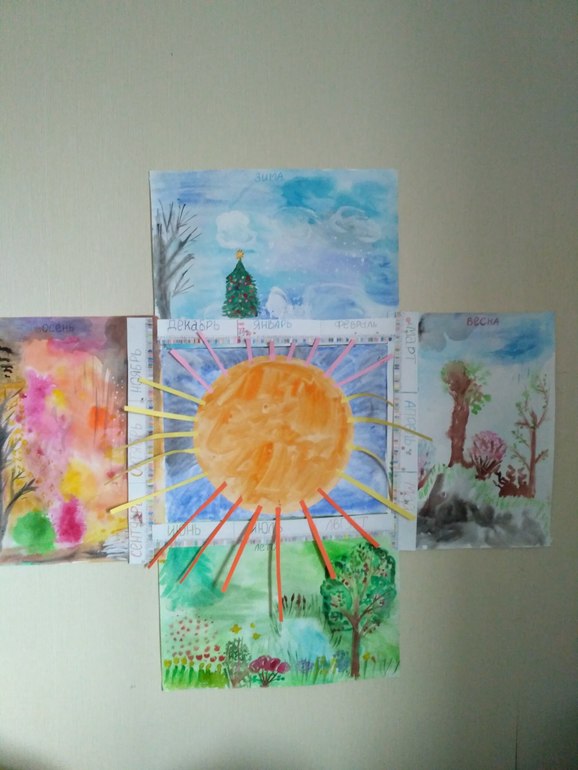 Решение заняться календарем пришло внезапно и потому он получился немного не продуманным. Если бы был большой лист бумаги, сделала бы такой, чтобы последовательность месяцев не нарушалась, а то здесь с летними месяцами неувязка. И солнце лучше сделать на квадратном листе, а не на прямоугольном.