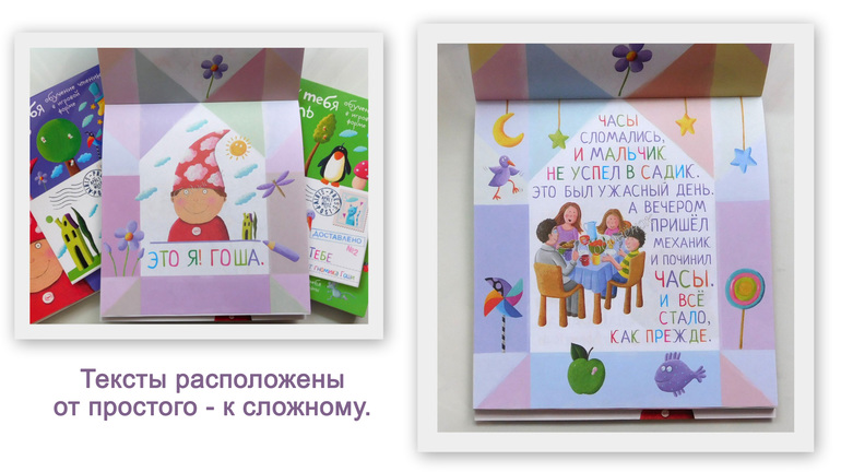 Твердо решив научить сына читать до школы, я стала пробовать разные буквари и пособия. Но ребенка ничего не «цепляло», пока не появилась серия «Я научу тебя читать». Вот это его действительно заинтересовало. Ведь тут надо не просто "тыкать в книжку пальчик", тут надо читать письма, которые приходят лично тебе от волшебного гномика Гоши! Чего он хочет, о чем рассказывает? - интересно! К тому же Гоша иногда и подарки присылает! :) (подарки, конечно, должны приготовить родители, Гоша лишь сообщит в письме, где ребенок может найти очередной подарок). При всём этом, пособия не требуют больших затрат времени от родителей. Ребенку интересно, и он читает сам!