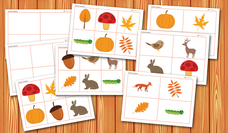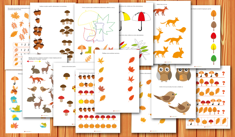 Тематический комплект заданий "Осенний" рассчитан на деток от 2,5 до 4 лет.