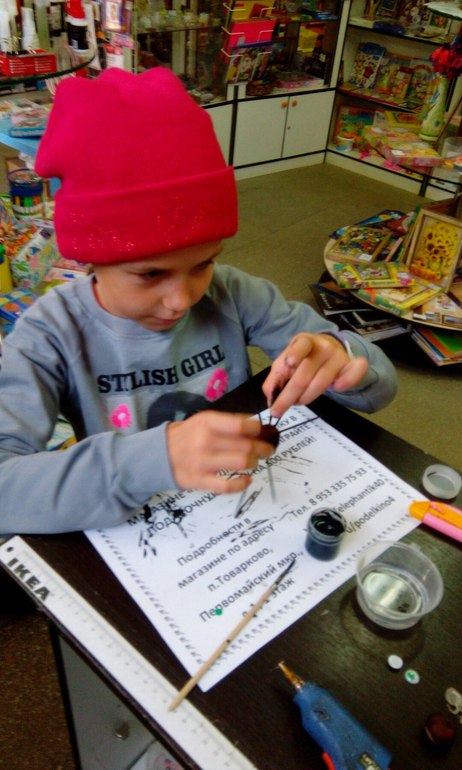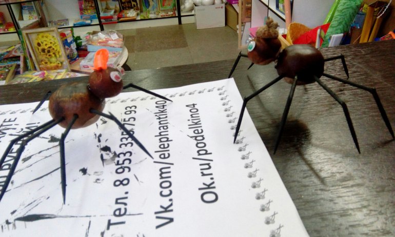 Санек помогала: красила паучьи лапы и вставляла их в тельце, выбирала глаза и цвет ленточки для бантика паучихи.