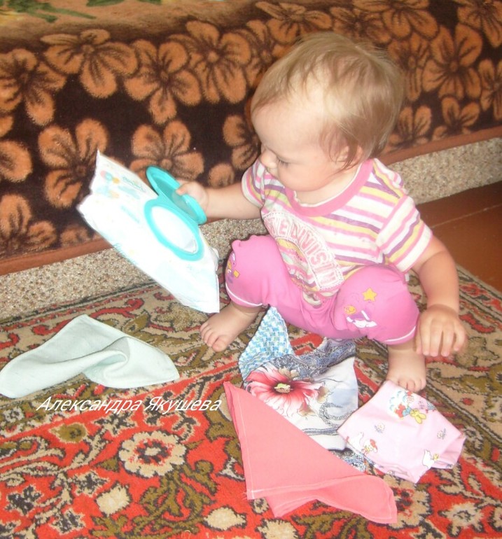 Разные на ощупь (вафля' махра' атлас' вельвет и многое другое) ткани режем на небольшие квадраты' обрабатываем края на швейной машине и складываем в упаковку от салфеток. Подойдет и баночка' и сумочка' и пакетик. Все! Часы игры и перекладывание тряпочек туда сюда обеспечены!