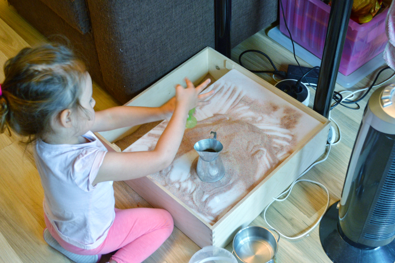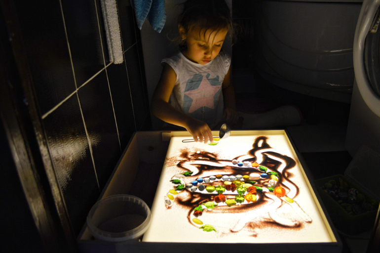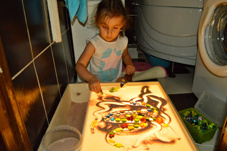 Летом закрывались в ванной в темноте и играли с нашим световым столом. Функционал у него большой: можно рисовать на песке, выкладывать цветные или прозрачные камешки, рассматривать фигуры, ещё много всего, ребёнок сам в процессе подскажет.