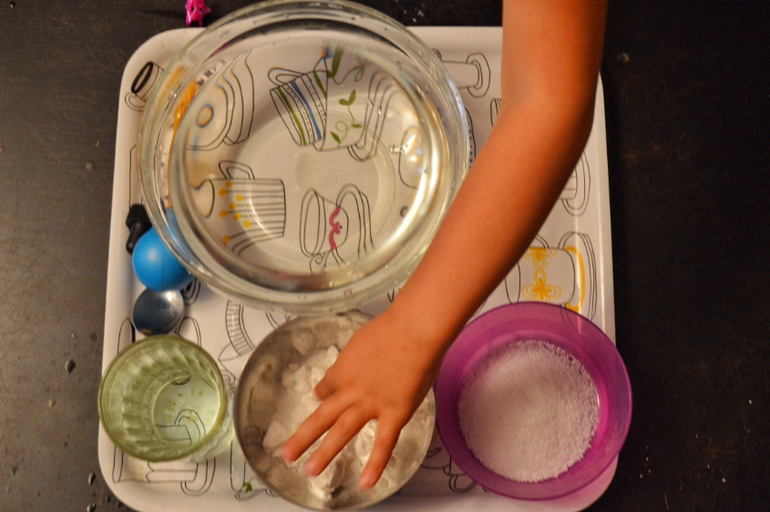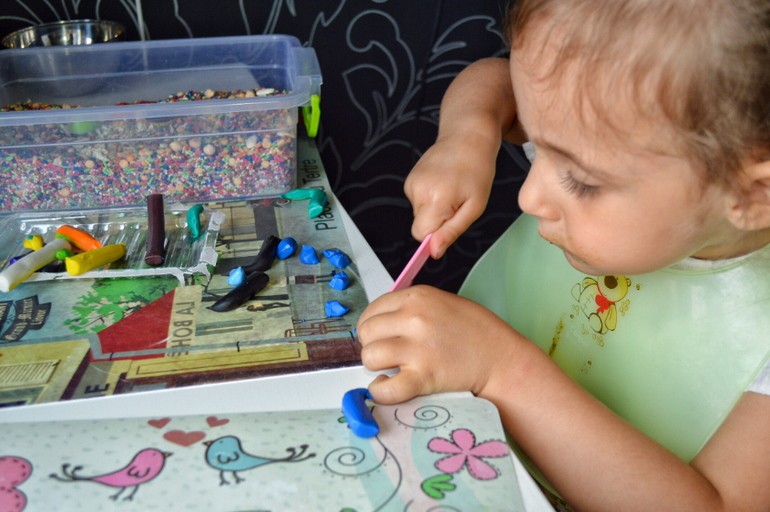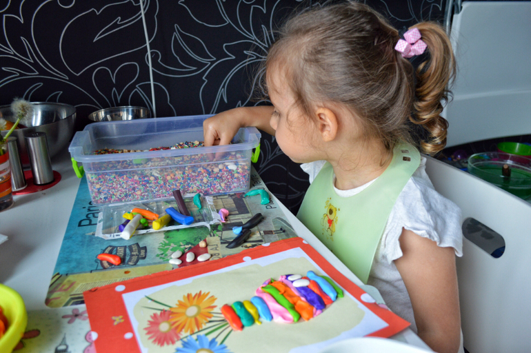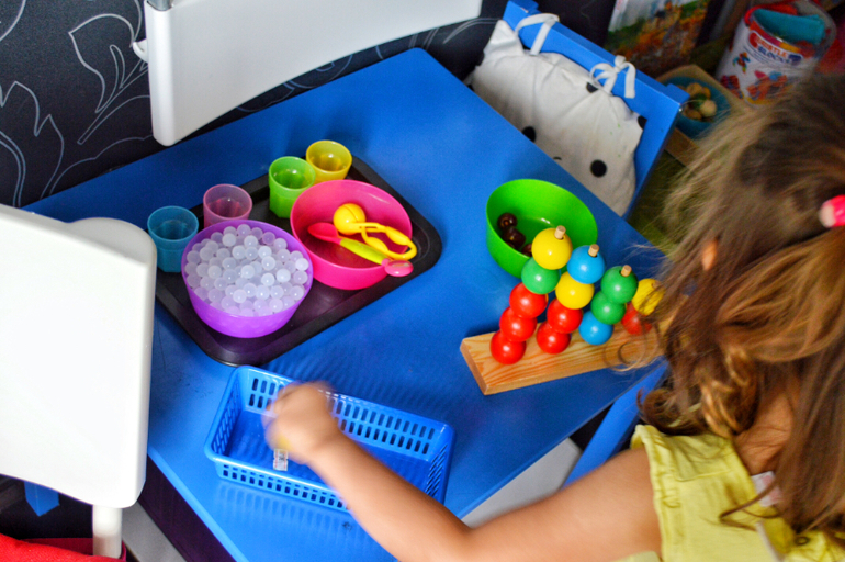 И ещё столик с остатками гидрогеля. Главное, подобрать материал для работы. Его не должно быть много, и все должно быть функционально. Аналогично делаю с плэйдо. Не вываливаю ей все, что есть для лепки, а кладу на день пару-тройку материалов. Через день заменяю их на другие. Заметила, что если выкладывать Даше много всего, на столе, она просто не приступает к игре сама. А, если дозированно-прекрасно занимается самостоятельно.